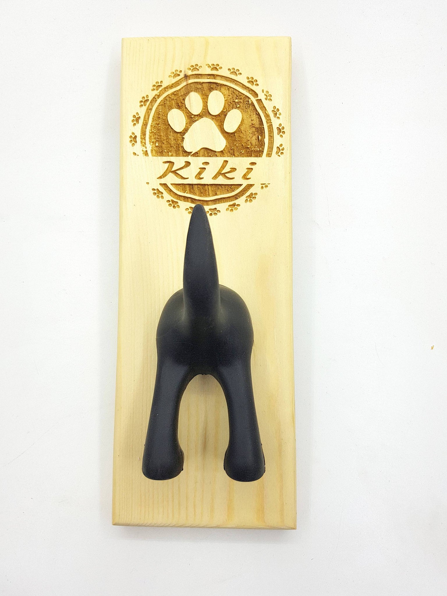 These are our take on the god leash hook totally customisable with your pets name in our standard image as pictured or maybe a silhouette of your breed of dog. This is a rubber hook on solid engraved wood with fixing brackets on the back.