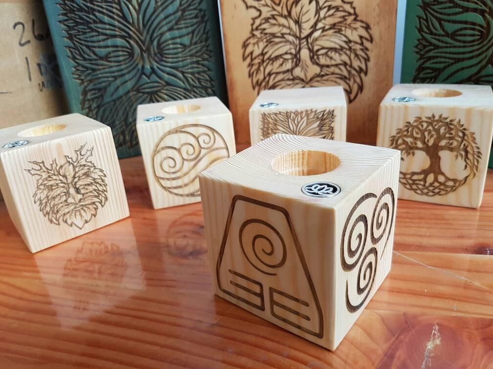 Our loverly tee light holders are engraved with the four elements on eaach side and cut from pine and coated in Danish oil. Approximately 90mm square and finished with about metal inlay on the top.