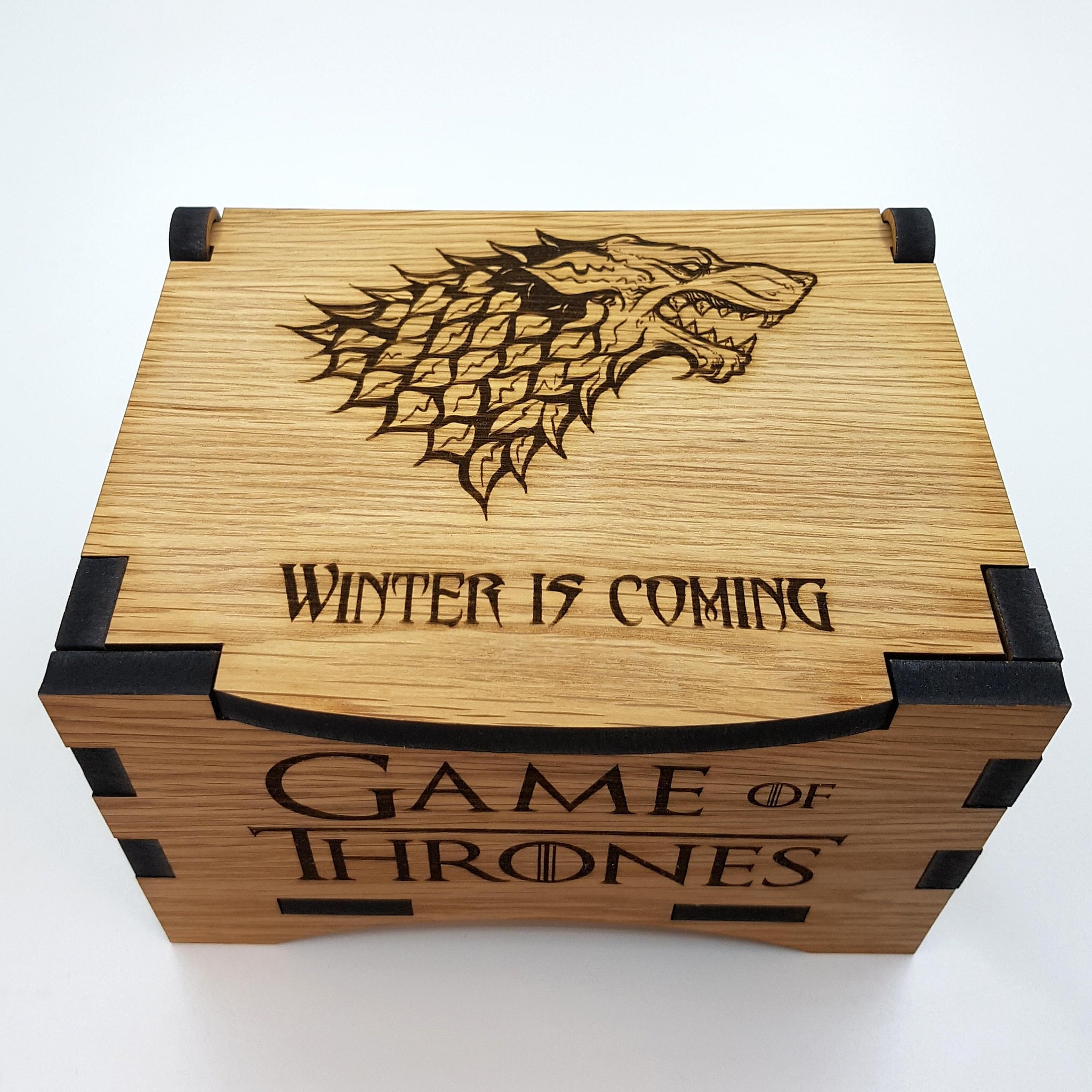 Our Game of Thrones House Stark box is entirely engraved and cut by laser. Our boxes are designed to hold your precious treasures and memories. All of our boxes are hand finished and oiled to bring out the grain of the oak.