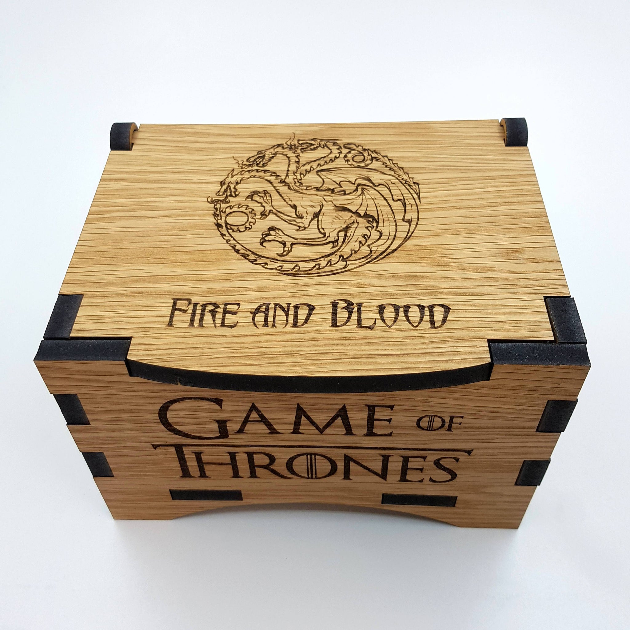 Our Game of Thrones House Targaryen box is entirely engraved and cut by laser. Our boxes are designed to hold your precious treasures and memories. All of our boxes are hand finished and oiled to bring out the grain of the oak.